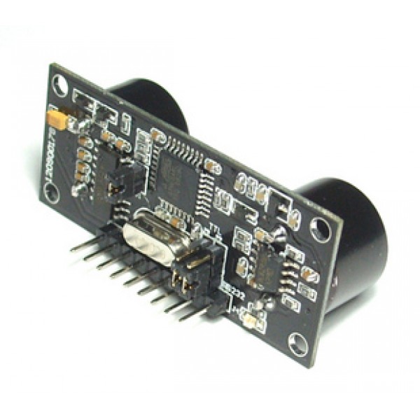 Medidor de distancia y detector de obstáculos mediante ultrasonidos. Suministra la salida en formato PWM o datos serie (nivel de tensión seleccionable TTL o RS232 mediante jumper). Dispone de una salida "sweep" para control de servo, y de un sensor de temperatura de 12bits.
