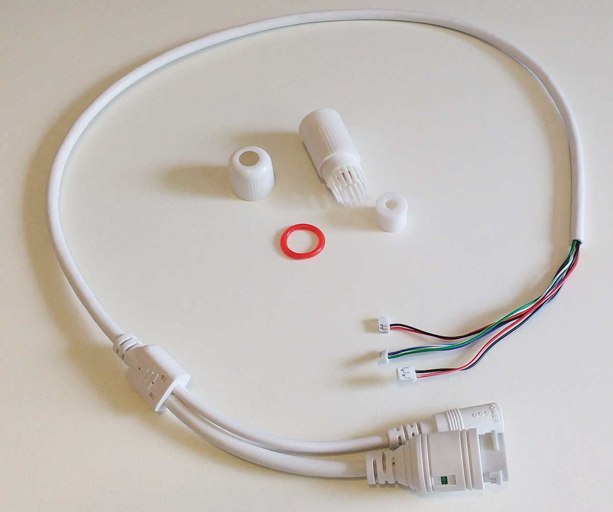 Cable Ethernet y alimentación para cámaras IP. Tiene la posibilidad de tomar alimentación por POE o desde una fuente externa.