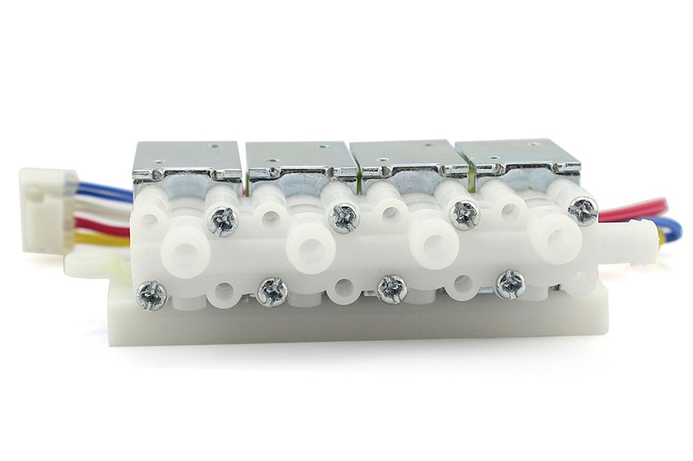 Bloque de 4 válvulas solenoide, con una entrada y 4 salidas de aire. Cada solenoide puede controlarse de manera independiente con una tensión de 12 VDC. El diámetro de la entrada y la salida es de 8mm.