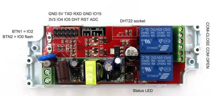 - SPDT 5 pins relay, Songle 10A/250VAC/30VDC, NOT connected to the AC mains. Three states: normally ON, normally OFF and Common pin.