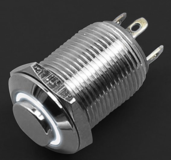Pulsador metálico (no plano) de tipo momentáneo, con iluminación led color BLANCO y diámetro de rosca: 12 mm. Incluye tuerca y junta. Incluye resistencia limitadora externa de 180 ohms para alimentar el LED de 3 voltios. Para aplicaciones tal como elevadores, dispensadores de boletos, aplicaciones de tipo industrial, etc. Calificado como IP67 (nivel de resistencia al polvo y agua).