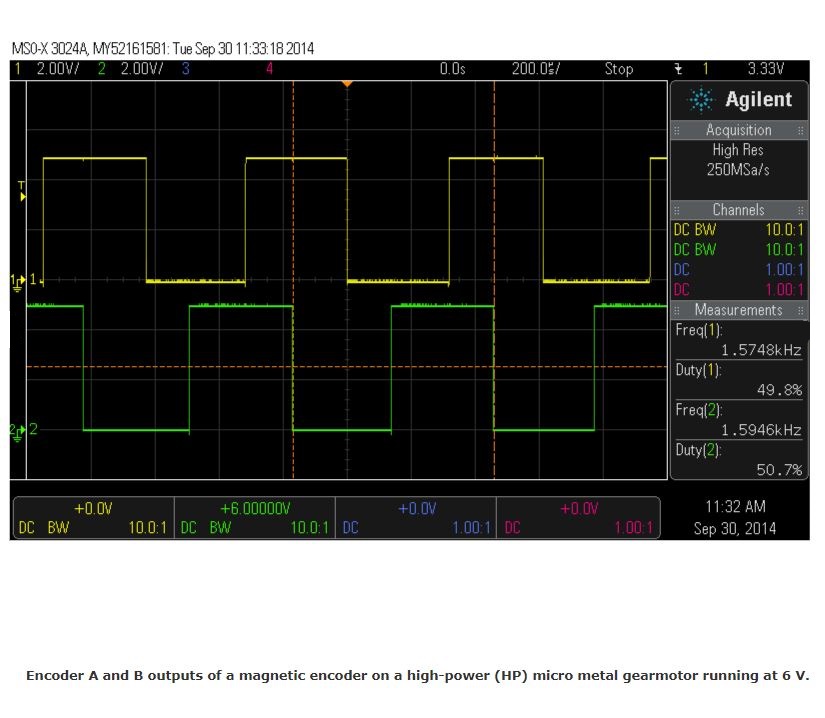 The sensors are powered through the VCC and GND pins. VCC can be 2.7 V to 18 V, and the quadrature outputs A and B are digital signals that are either driven low (0 V) by the sensors or pulled to VCC through 10 kΩ pull-up resistors, depending on the applied magnetic field. The sensors’ comparators have built-in hysteresis, which prevents spurious signals in cases where the motor stops near a transition point.