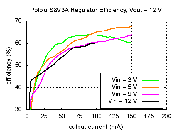 The efficiency of a voltage regulator, defined as (Power out)/(Power in), is an important measure of its performance, especially when battery life or heat are concerns. As shown in the graphs below, this switching regulator typically has an efficiency of 55% to 65%. The maximum achievable output current of the board depends on many factors, including the ambient temperature, air flow, heat sinking, and the input and output voltage. See the graphs below for more details on the typical efficiency and output currents for this voltage regulator.