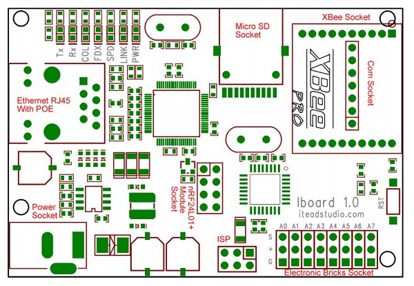 Iboard can be used as an Ethernet, wireless communication project development platform. Iboard support POE (power on Ethernet) power supply, and Micro SD for mass storage. There are some 3pin electronic brick/ sensor brick interface breakout on board, it offer an easy way for a quick prototyping. You can setup a web server through which you may communicate with a remote Arduino using XBee radios, bluetooth or APC modules. This information can be posted to a web site, or to Twitter.