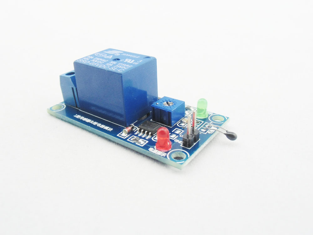 Adjust the on-board potentiometer to adjust the sensitivity. The relay and the signal indicate LED would ON/OFF when the temperature is higher/lower than the threshold set by the potentiometer.