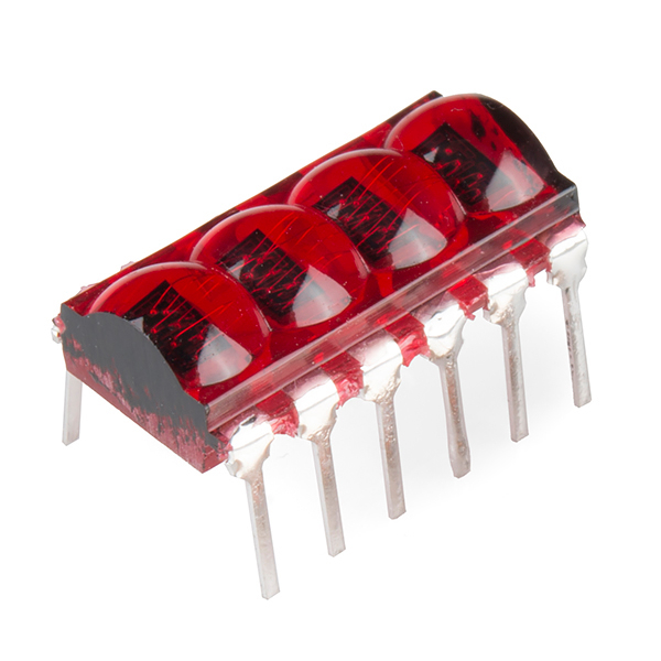 Description: This is the HP QDSP-6064 bubble display, a tiny, 4-digit, 7-segment numerical indicator. THis little guy is perfect if you need some user feedback from your system, but don’t want to fiddle with LCDs or other display options. The Bubble Display comes in an easy-to-use 12-pin DIP package and can be used in breadboards, protoboards, or PCBs.