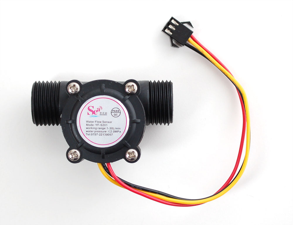 Caudalímetro para agua de cuerpo plástico, con salida de pulsos, basado en efecto Hall. Posee roscas estándar de 1/2" para fijar la grifería.